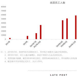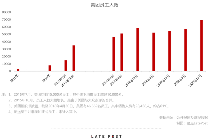 美团员工数量迅速增加的原因之一也是大合并,2015 年 10 月,美团与大众点评合并,人数增加一倍,达到 3.5 万人。