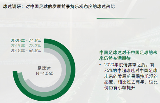 德勤2021年4月发布的《中国足球协会超级联赛2020赛季商业价值白皮书》显示,2018年至2020年,对中国足球的发展前景持乐观态度的球迷占比连续上升,分别为66.8%、73.3%、74.8%。另外,球迷普遍认为青训体系和足球教育对于中国足球的未来发展至关重要。