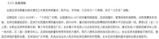 从政策方面来看,2021年5月,体育总局发布关于开展全国足球发展重点城市建设工作的指导意见。其中,近期目标(2021-2025年)为“十四五”时期,全国建成16-18个政府重视程度高、足球底蕴好、管理体制机制顺畅、训练竞赛体系完备、足球发展基础坚实、足球文化氛围浓厚的重点城市。到2025年,重点城市的职业联赛组织和竞赛水平达到全国一流,拥有2支(含)以上男、女职业足球甲级俱乐部;青少年足球普及广泛,全市青少年足球人口占在校学生人数总数达到50%,建设完成1个国家级青训中心和一批市级、区(县)级青训中心;足球场地数量和利用率有较大提升,每万人拥有足球场地达到1块以上;社会足球发展基础不断夯实,基层足球组织蓬勃发展,足球活动广泛开展,形成全社会关心和支持足球发展的良好氛围。全市足球发展的基本指标位居全国前列。