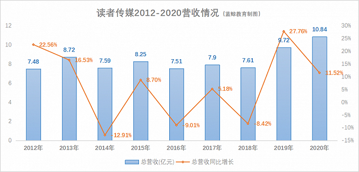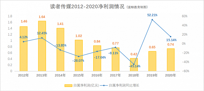 从营收数据上来看,2019、2020年出现了明显增长。2019年,读者传媒实现营收9.72亿元,直接跨越8亿元门槛;2020年其营收突破10亿,达到10.84亿元。利润也随之回归增长,2019年,读者传媒实现净利润0.65亿元,同比增长52.21%;2020年增至0.74亿元,同比增长15.14%。