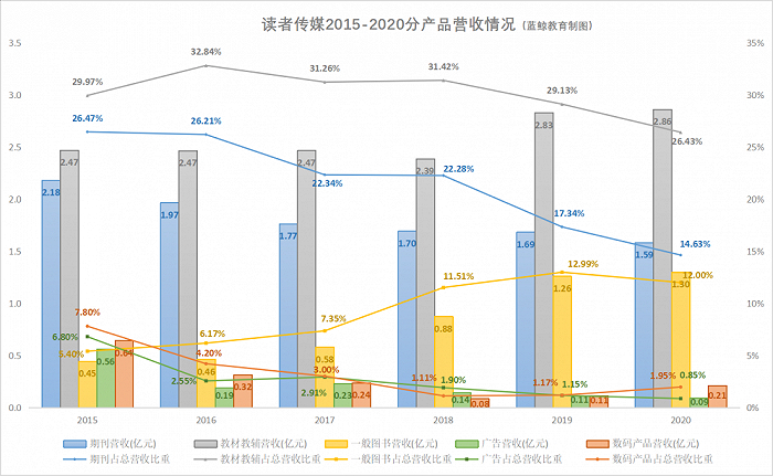 期刊业务在不可避免地下滑。自2015年至2020年,期刊产品营收从2.18亿元降至1.59亿元;占总营收比重从26.47%降至14.63%。两项指标均连续六年呈下降趋势。
