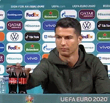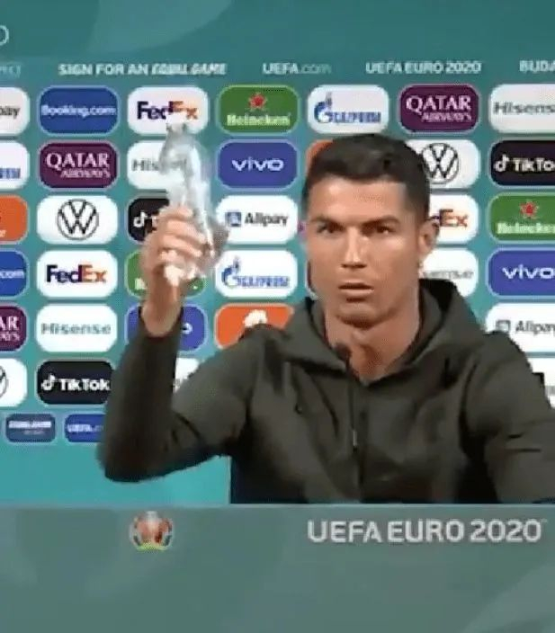 据环球时报综合《每日邮报》、《赫芬顿邮报》报道,在当地时间6月14日的发布会上,C罗挪开桌上两瓶可乐,随后拿来一瓶水说,“喝水,不要可乐”。