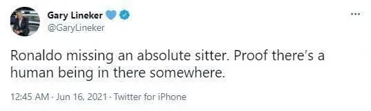 在比赛的上半场,葡萄牙在进攻端略显乏力,并没有收获进球。而C罗在上半场的发挥也没能达到最佳,更是遗憾错失了一次近乎空门的机会。随后,英格兰足球名宿莱因克尔在个人社交媒体上发文称:“C罗错失了一次近乎‘保姆球’的机会。这也证明他仅仅是个人类。”