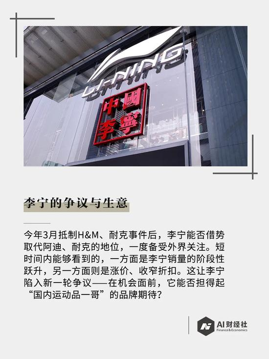 有人认为李宁作为国内运动品牌,抓住了跑赢耐克的机会,但受访的业内人士却对此持保守态度。反倒是李宁对外表现出了格外的品牌自信:涨价。瑞信近期调查数据显示,国内运动品牌中,李宁在服装和鞋类领域的折扣收窄,价格涨幅最大。有网友调侃,“之前没钱买李宁,现在没钱买李宁。”