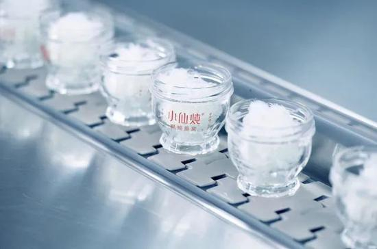 我们燕窝是先精准投料灌装到这个瓶子里然后封口,在炖煮的设备里连着这个瓶子360度转。为什么我们把这个瓶子设计成像一个小炖盅,就是传达一个理念——手工炖燕窝。