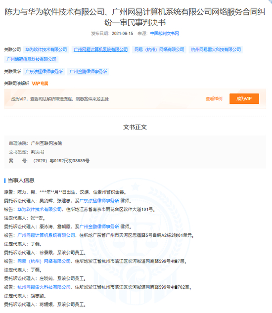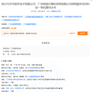 天眼查APP显示,近日,陈某与华为软件技术有限公司、广州网易计算机系统有限公司网络服务合同纠纷一审民事判决书公开,案号(2020)粤0192民初38689号,审理法院为广州互联网法院,原告为陈某,被告为华为软件技术有限公司、广州网易计算机系统有限公司、网易(杭州)网络有限公司、杭州网易雷火科技有限公司。