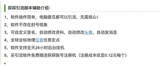 据了解,一些电商平台会提供探探的一系列软件脚本服务,价格从几十元到几百元不等,一个账号可以导流300多个客户。还有探探的分身服务,一个手机能最多开七个探探的分身。