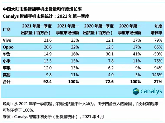 自华为遭遇芯片危机后,国内市场份额被小米和OPPO等企业分食。2021年Q1季度的手机出货量排行榜显示,OV两大企业保持了60%的增长,位居行业前两位,华为和小米位居三四位。