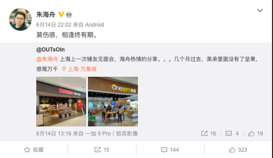 有这些锤粉,也会让朱海舟内心更有力量。就在6月14日,有“锤友”分享了锤粉见面会的照片,提到某线下店里面已经没有坚果手机在售,令其感慨万千。朱海舟还安慰锤粉,“莫伤感,相逢终有期”。