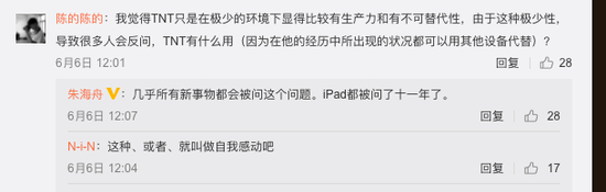 比如在微博上,朱海舟说自己最近在买房,就用TNT看房,而TNT OS 的活页窗+多窗口系统特色,能让其想对比多少套对比多少套,十分方便。底下不少网友评论,TNT实际用途比较少。朱海舟会亲自辩论,认为这是新生事物不可避免会遇到的问题。另一些网友则表示:“或许这就是自我感动吧。”