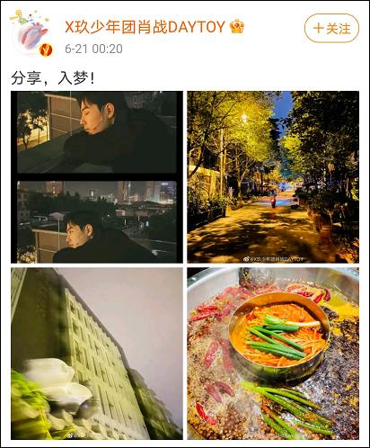 6月20日,肖战参演的话剧《如梦之梦》成都站最后一场演出收官。当晚,肖战与剧组成员选择在谭鸭血老火锅店举办庆功宴。21日凌晨,肖战发布微博,配图中有火锅照片。