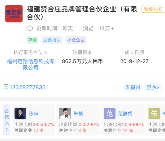 据公开资料显示,火锅品牌贤合庄成立于2015年,由演员陈赫、歌手叶一茜与主持人朱桢合伙成立。陈赫为福建贤合庄最终受益人,持股比例为38.55%。