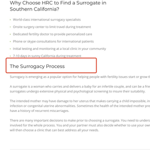 值得注意的是,在中文版简介中,HRC Management旗下辅助生殖机构中并未显示代孕相关字眼。但当页面切换为英文介绍时,有关代孕业务的简介依然赫然存在于机构官网中。