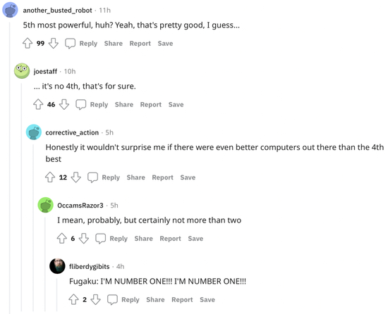 粉丝看到后非常激动,表示如果特斯拉是第五,那么肯定没有第四。于是后面这位老哥看不下去了:‘富岳:我是第一!’。