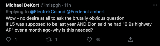 ‘哇,虽然根本不想问这个残酷的问题:特斯拉的自动驾驶不是在去年就实现了么,为什么还需要这个?’