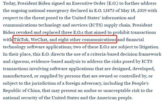6月9日签署了一项行政命令,撤销了特朗普试图禁止美国企业与TikTok、微信和其他中国移动应用程序交易的三项行政命令,这也被部分评论解读为美国政府放松了对TikTok的压力。