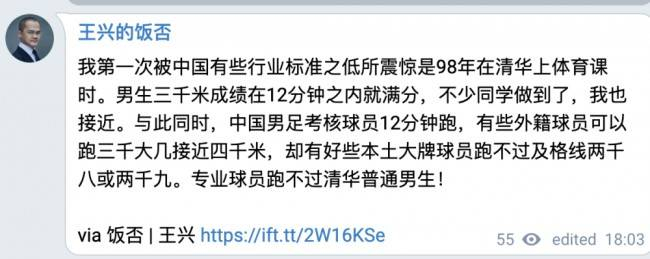 2020年7月8日,因认为国内足球行业标准太低,王兴发了一条饭否,调侃专业的足球运动员连清华普通男生跑不过。此言论随即遭到整个足球界的回“怼”,同时,美团App也遭到多位足球运动员的卸载与抵制。随着事情的发酵,网友们大多支持足球界人士回“怼”,认为王兴的言论哗众取宠,只是在恶意消费国足。