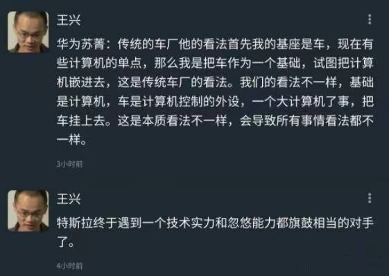 2021年4月17日,华为联合北汽旗下新能源品牌极狐发布首款Huawei inside智能豪华纯电轿车北汽阿尔法S。对此,王兴在饭否上宣称,“特斯拉终于遇到一个技术实力和忽悠能力都旗鼓相当的对手了”,并附上了华为智能驾驶总裁苏菁的一段话。