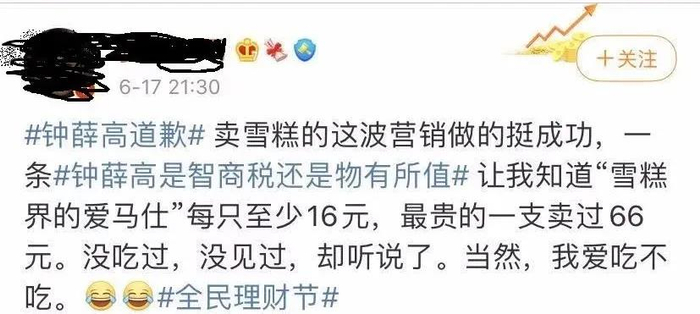 同时,钟薛高官方还对虚假广告黑历史做出道歉,但有网友并不买账。有网友认为,钟薛高这波营销做的很成功;还有网友认为,网红产品价格应该恢复理性,少些噱头;甚至有网友认为,钟薛高的道歉只是向市场低头、向大众的钱包低头罢了。