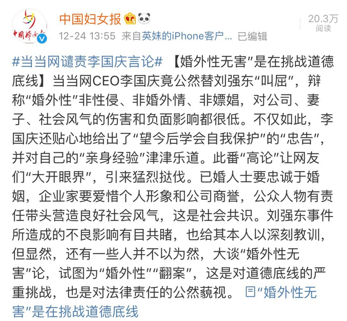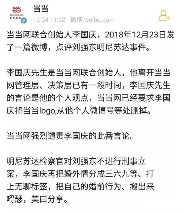 2018年12月23日,李国庆在微博上又发文力挺刘强东,称其明尼苏达事件“虽杀风景,但划得来”。这一次的发言不仅招来网友的谴责,还遭到当当网官方撇清关系,称“李国庆把婚外情分成三六九等、打上无聊标签,把自己的婚前行为、搬出来嘚瑟,美曰分享”。同时,中国妇女报也对李国庆此次的“狂妄”发言点名,称其言论“是对道德底线的严重挑战,也是对法律责任的公然藐视”。