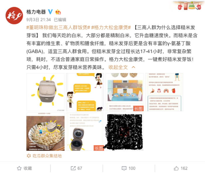 几天后,格力官方微博于9月3日和9月5日两次发文解释董明珠口中所说的三高人群电饭煲,并指出要煮的米应是糙米而非白米,而此款电饭煲的主要卖点是可以让糙米快速生芽,做出糙米芽饭,因此更适合三高人群使用。