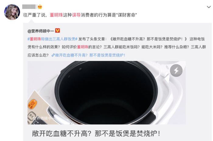 2019年8月28日,格力电器董事长董明珠一场公开活动上自豪的表示,为了满足三高人群的需求,格力已做出了三高人群电饭煲,保证让三高人群敞开吃米饭,血糖也不升高。随后,关于“保证你敞开吃,血糖不升高”的言论迅速在网上引发争议和质疑无数。