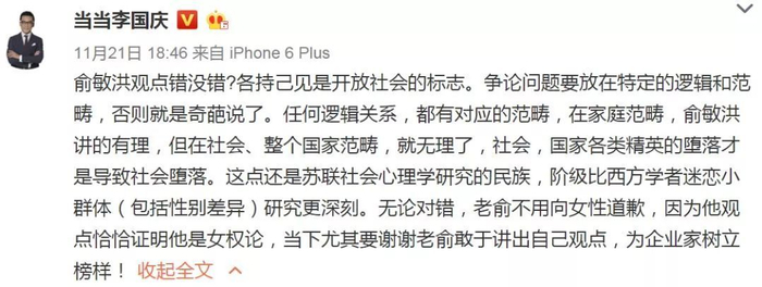 2018年11月21日,当当网创始人李国庆在微博上声援俞敏洪,称“无论对错,老俞都不用向女性道歉”。被网友指责发言“不合时宜”、“蹭热点”,以及“落后、扭曲的性别观”,甚至“蔑视女性”。