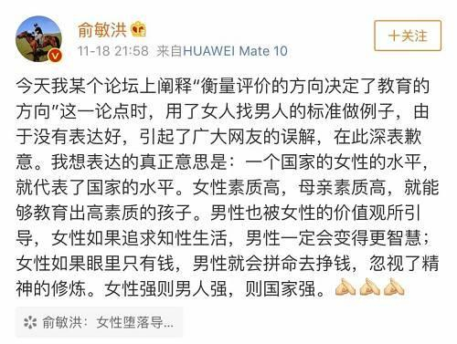 2018年11月18日,在一场学习教育会议上,新东方创始人俞敏洪在提及一个教育观点时畅所欲言,直呼“因为中国女性的堕落,导致整个国家的堕落”。这一言论在网上受到强烈谴责。当晚,俞敏洪就发布“致歉”声明,表示,用了女人找男人的标准做例子,由于没有表达好,引起了广大网友的误解,在此深表歉意,并纠正了自己想表达的真正意思。