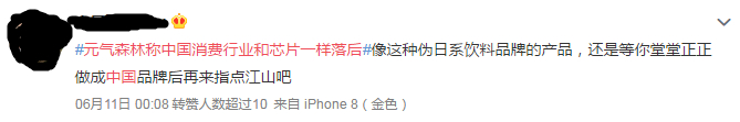 有网友就说,元気森林“假洋鬼子,吃相太难看”、“做成中国品牌后再指点江山”等等。