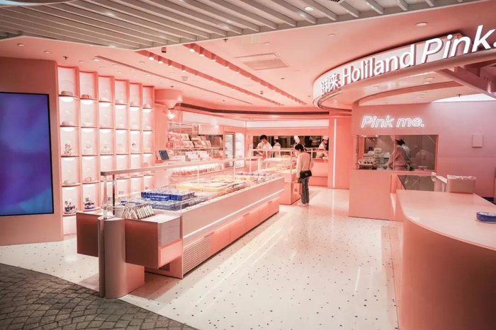 进入上海之后,好利来也改变了过去传统的门店设计和体验。它在上海的门店以粉色为主要色系,它的第二家门店上海美罗城店直接叫作Pink主题店。除了粉色的元素之外,员工也身穿粉色围裙,并且清一色身高180厘米以上的年轻男店员和高颜值的年轻女店员。这样的配置也在社交网络上获得了不少流量。