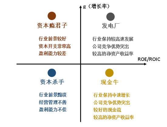 汇添富偏爱的公司是那些自由现金流充沛、增长强劲,被称为发电厂模式的公司,典型的就是白酒龙头;那种增长性很好,但高度依赖资本开支的公司被称为资本瘾君子;而增长比较慢,但股东回报比较好的企业就是现金牛;最差的是那种烧钱也换不来增长的,被称为资本杀手。