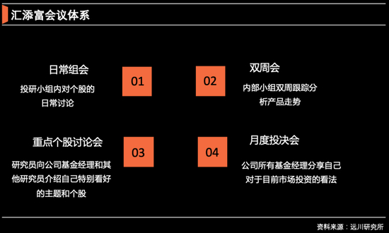 日常的晨会是组内讨论个股;双周会是组内跟踪分析产品走势;周二、周四的重点个股讨论会是研究员向全公司基金经理路演特别看好的机会;月度投决会则由基金经理们做相互分享。一个典型汇添富研究员的时间分配中,1/3做案头,1/3在调研,另外1/3就是在准备开会。