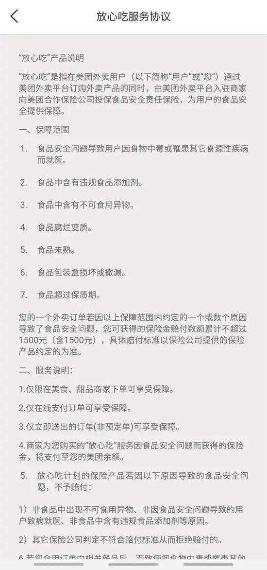 如:“仅立即送出的订单(非预定单)可享受保障”、“食物中毒应在订单送达后24小时内在二级以上公立医院就医,否则理赔申请要求将可能被拒绝”、“当保险公司支付完毕理赔款项后,即视为当次争议已处理完毕,消费者承诺不再主张任何权利或二次赔偿”、“食品中含有不可食用异物,按照已实际支付的食用订单中含有异物的该相关餐品的金额进行赔偿,最高赔付不超过1500元”等。
