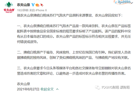 但随后,农夫山泉在微博澄清称该产品并无桃子成分。