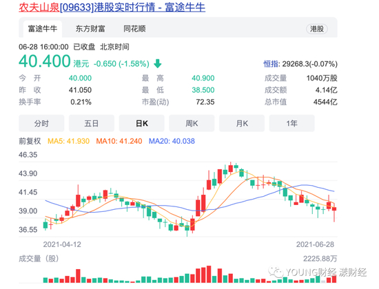 农夫山泉股价下跌,截止6月28日收盘,股价为40.4港元/股,总市值4544亿港元。自2021年初创下67.6港元的高价以来,农夫山泉的股价一路下滑,较最高点已跌超40%,市值蒸发3000亿港元,董事长钟睒睒身价大幅度缩水,5个月来蒸发约2700亿港元。