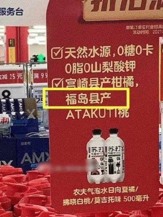 农夫山泉苏打气泡水在微信公众号、卖场海报等宣传物料中,使用“宫崎县产柑橘”、“福岛县产ATAKUTI桃”这样的字眼,让消费者误以为其中含有日本水果,在被质疑后又澄清是创制了“类似拂晓桃风味的产品”。