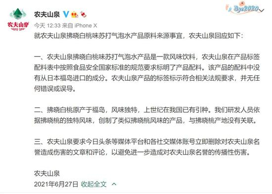 6月27日,官方回应,“该产品的配料中没有从日本福岛进口的成分……与拂晓桃产地没有关联。”