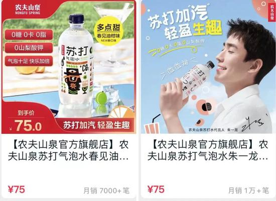 2021年4月1日,农夫山泉推出了无糖苏打气泡水,分别有白桃、莫吉托和日向夏橘三种口味,2个月后,又推出春见油柑口味。由流量明星朱一龙代言,每瓶500ml,售价5元,天猫旗舰店月销量超1万笔(三种口味)。