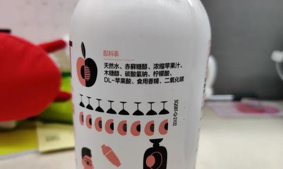 记者注意到,农夫山泉拂晓白桃味苏打气泡水的产品配料中,没有白桃成分,唯一的水果成分是“浓缩苹果汁”。