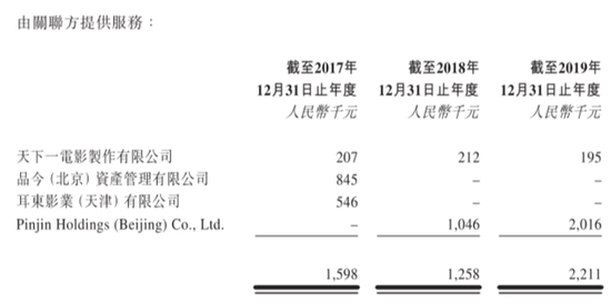 还有一个值得注意的现象是,2017年-2019年,由关联方提供的服务中,其中品今资管、Pinjin Holdings(Beijing)Co.,Ltd.两家公司三年向耳东影业提供服务金额约400万元。