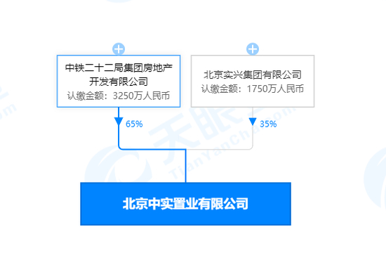 据天眼查显示,项目开发商北京中实置业有限公司由中铁二十二局集团房地产开发有限公司和北京实兴集团有限公司共同持股,其中,中铁二十二局集团房地产开发有限公司持股65%。
