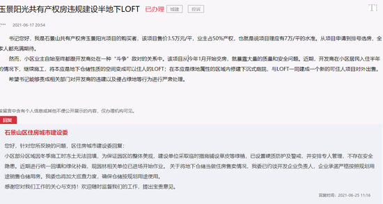 近日,人民网“领导留言板”栏目下,出现多条对石景山共有产权房玉景阳光项目的投诉,投诉主要内容为私自违规改建,开发商为北京中实置业有限公司。