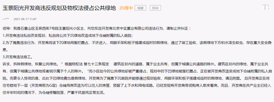另一则投诉同样发布于6月17日,但目前显示“办理中”。该则投诉同样针对玉景阳光小区开发商违法私自改变规划问题,指出开发商私自将公共下沉绿地改造成地下仓储附属的私人庭院,并且将下沉绿地用围栏圈占,不许进入,用脚手架和板子搭建成临时的假绿地,通过了竣工验收。投诉中还提到,该假绿地下方积水滋生蚊虫,存在重大安全隐患。