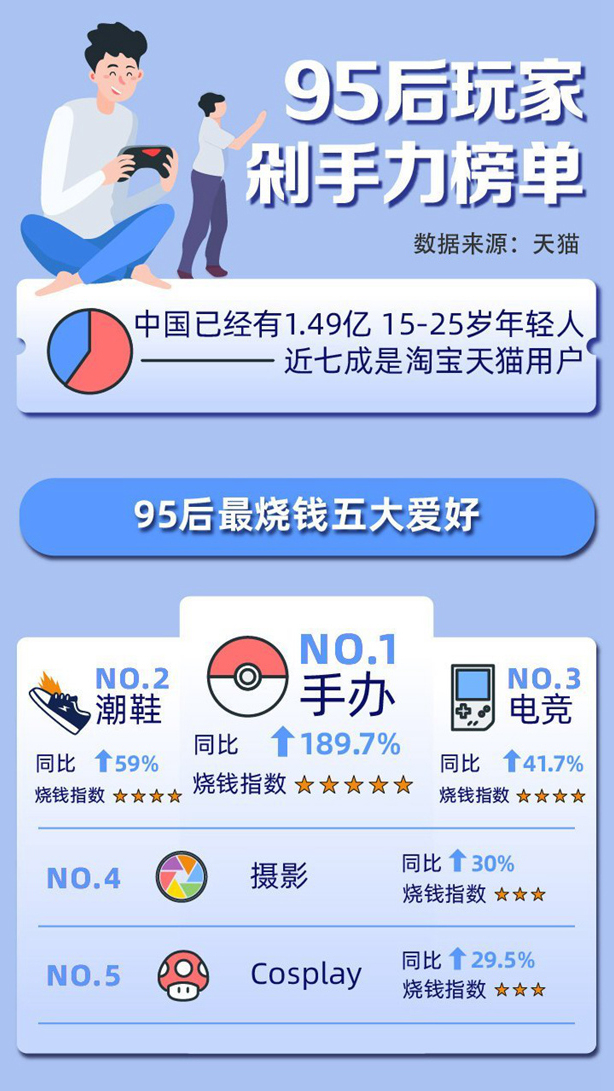 伴随市场的快速发展,“潮玩”也在逐渐展现多元一面,年轻人对于潮玩市场正在展现出异于往常的消费力。天猫此前发布的《95后玩家剁手力榜单》中,“95后”最烧钱的五大爱好里,潮玩手办高居第一名。