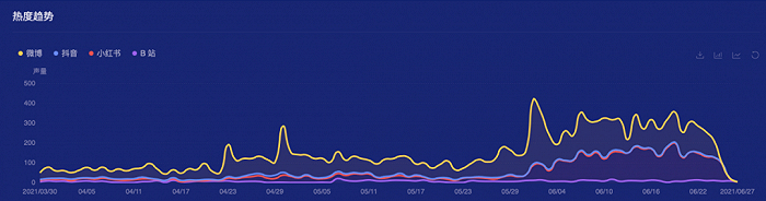 根据时趣洞察引擎可以看到,自六月以来泡泡玛特的热度持续上升。虽然有很多玩家表现出对于盲盒的热情减弱,但是新品的发布后,品牌依旧声量很高,话题热度不减。