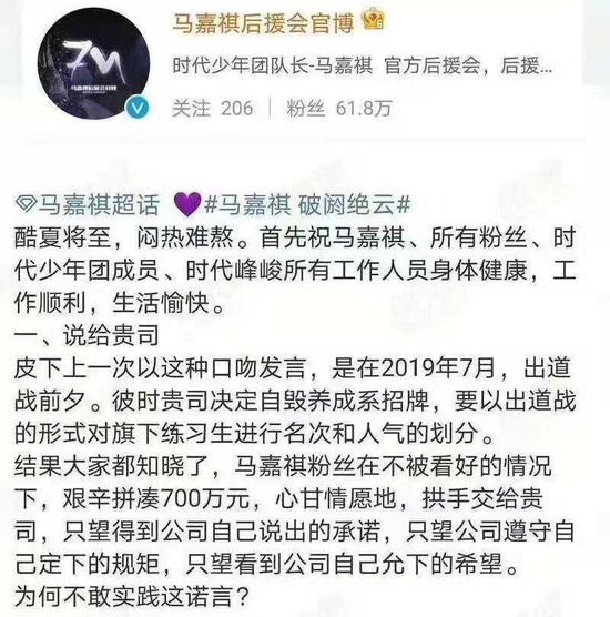 声明内容引起了饭圈“众怒”,马嘉祺后援会率先发微博“反击”,称公司的声明是“反捅他一刀”,并列举了过去为马嘉祺做出的努力。其中列举出了在2019年7月开始的出道战中,粉丝曾经“艰辛拼凑700万元”,送他以第一名的成绩在时代少年团出道。