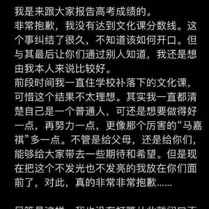 6月26日凌晨,马嘉祺发布微博公布此事,并对父母和粉丝表达了抱歉。随着词条#马嘉祺 我没有达到文化课分数线#登上热搜,上述分数也在网络广泛流传。