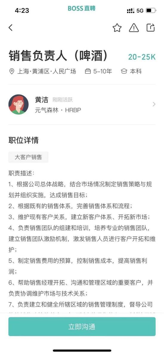 新浪财经也注意到,在Boss直聘上,元气森林已经在默默招聘“酒”类销售。