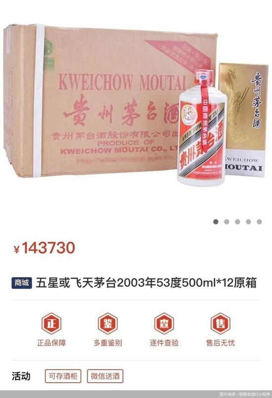 苏富比拍出的天价茅台,其实是茅台老酒价格的一次高度曝光。北京商报记者登录歌德老酒行小程序商城看到,2003年53度500ml装的飞天茅台,售价为9050元/瓶,同年份整箱飞天茅台售价为14.37万元。1995年53度500ml装的飞天茅台,售价更是达到了31000元/瓶。