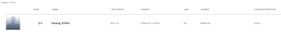 宁德时代第二大股东为副董事长黄世霖,持股11.2%,目前身家高达213亿美元,折合人民币1377亿元,全球排名84。